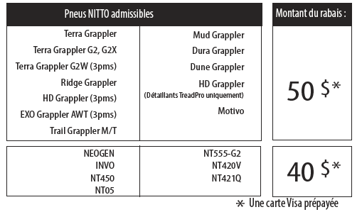 Instructions : Offre valide pour tout achat au détail admissible fait au Canada chez un détaillant NITTO autorisé participant. Pour être admissible au rabais, le consommateur doit acheter au moins quatre (4) pneus neufs NITTO admissibles pour le même véhicule. L’achat doit être effectué entre le 13 mars au 30 juin 2021. Pour être admissibles, les coupons-réponse doivent être reçus au plus tard le 30 auot 2021 à 23 h 59 HNE, et ils deviennent la propriété de NITTO Tire Canada Inc. Le rabais comprend la TPS-TVH et la TVQ-TVP, le cas échéant.